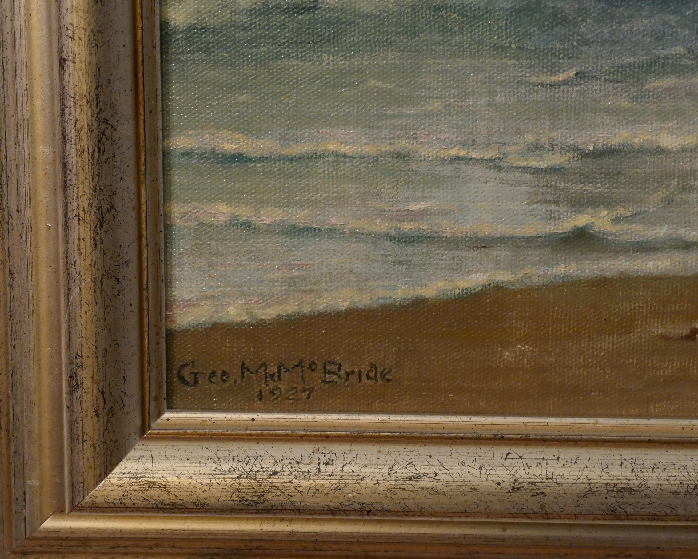 Close-up of the artist’s signature on the seascape oil painting. In natural light, the initial "G" does not stand out from the rest of the signature.
